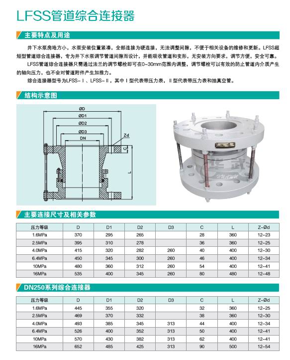 LFSS管道綜合連接器只需通過法蘭的調(diào)節(jié)螺栓即可在0~30mm范圍內(nèi)調(diào)整,調(diào)節(jié)螺栓可以有效的防止管道內(nèi)介質(zhì)產(chǎn)生的軸向壓力嗎,也不會(huì)對(duì)管道附件產(chǎn)生加推力。